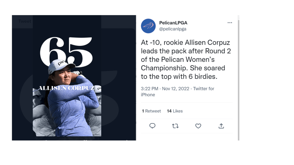 The second round of the Pelican Women’s Championship was filled with highlights. Maja Stark had the best showing of all players in the field with the top score of 63 at seven under for the round. Lydia Ko showed her skills with a remarkable recovery from under a tree. Nelly Korda swept up sand from the greenside bunker and sent her ball sailing right near the hole. Yet, Corpuz dazzled with her 65 on her scorecard.